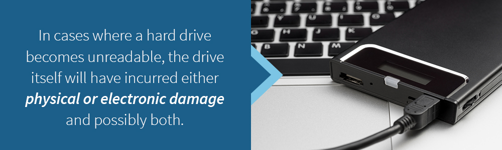 In cases where a hard drive becomes unreadable, the drive itself will have incurred either physical or electronic damage and possibly both. In scenarios such as these, data recovery will likely be the only way to salvage the data that was