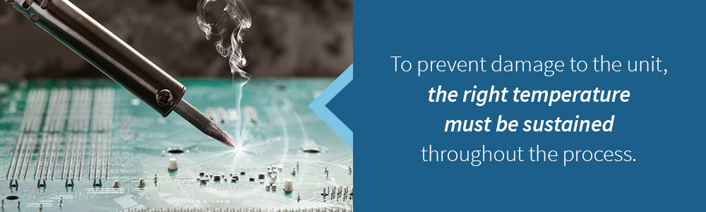 The steps required of this process preclude the use of manual soldering tools. Desoldering tasks should be confined to stations with a programmable temperature gradient and where components can be removed automatically. A station of this type will generally rely on a mix of air-based convection and infrared radiation heating. The necessary heating curves can be programmed and employed through the attached air nozzle.